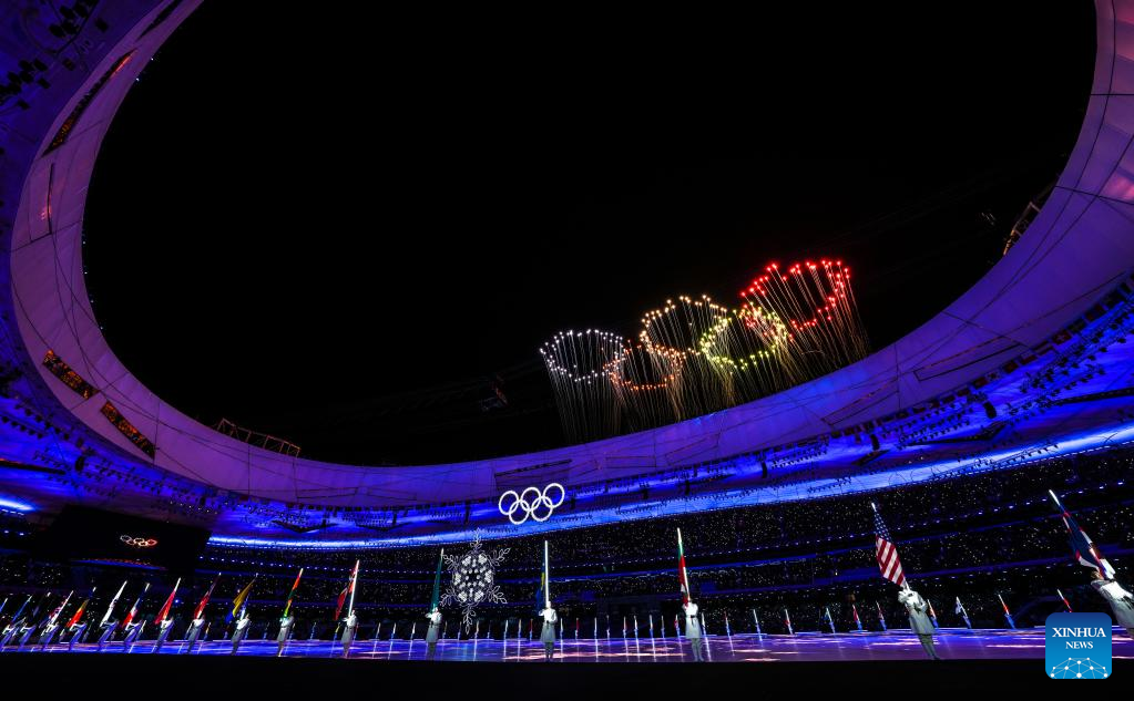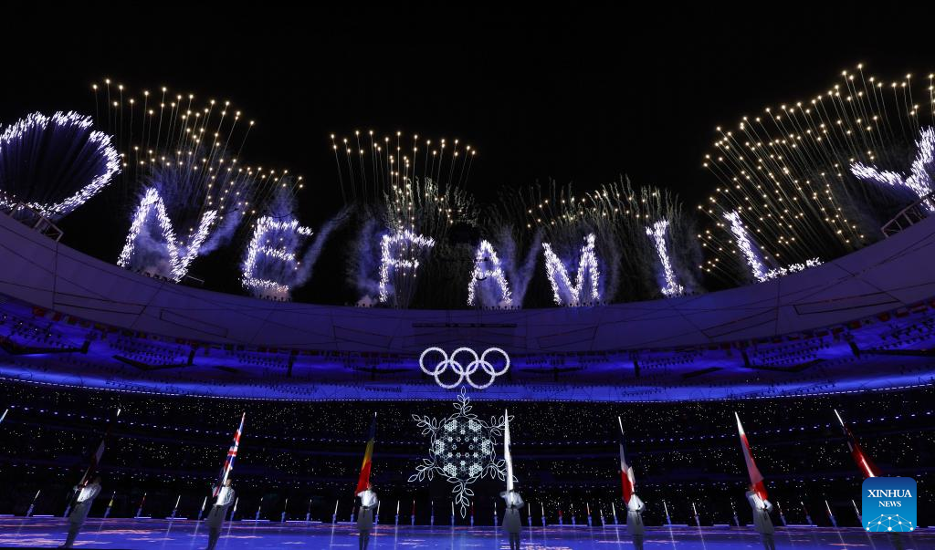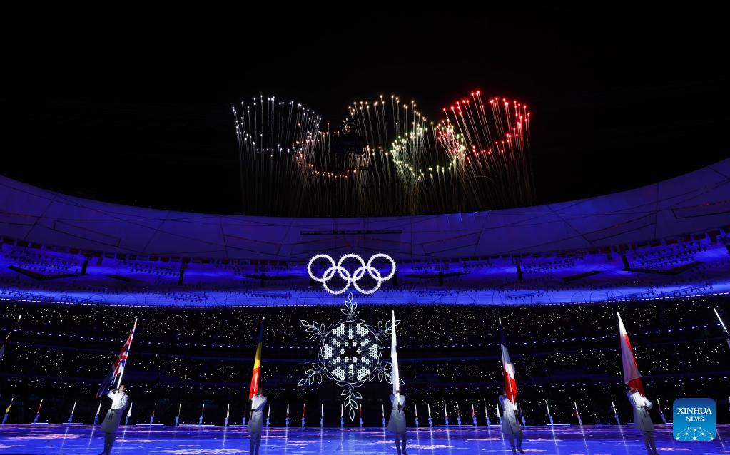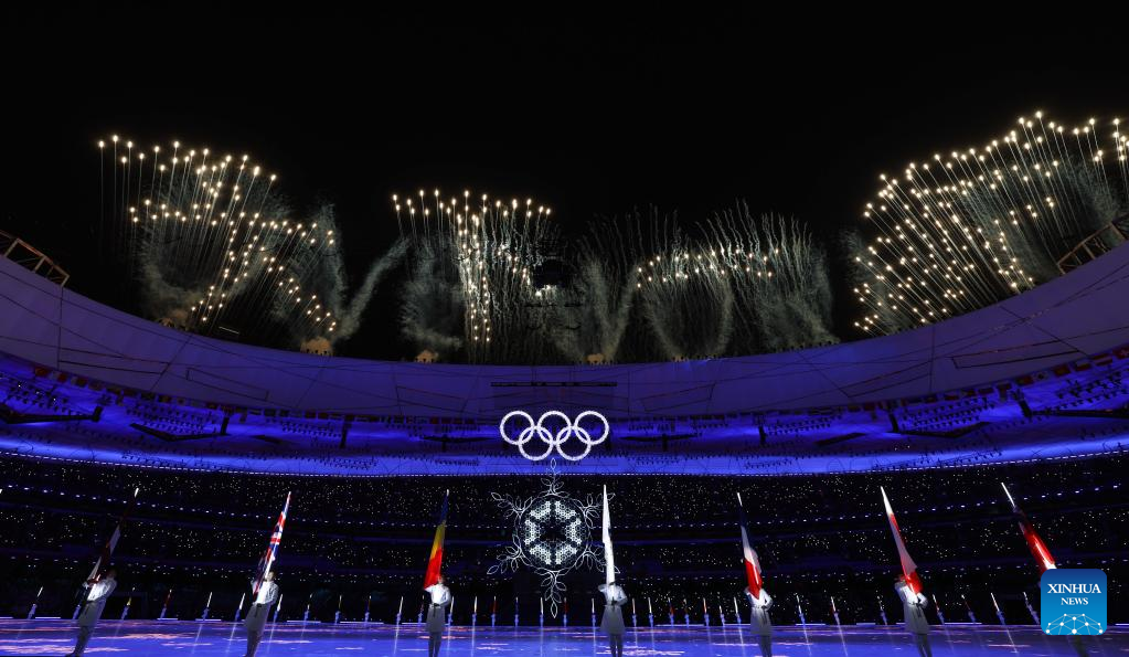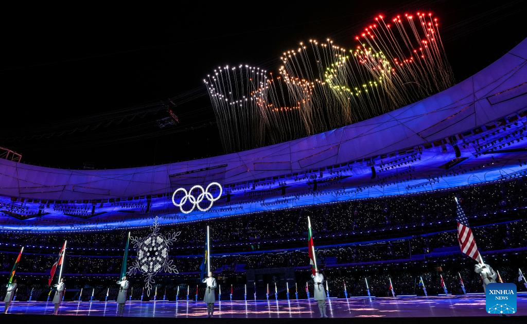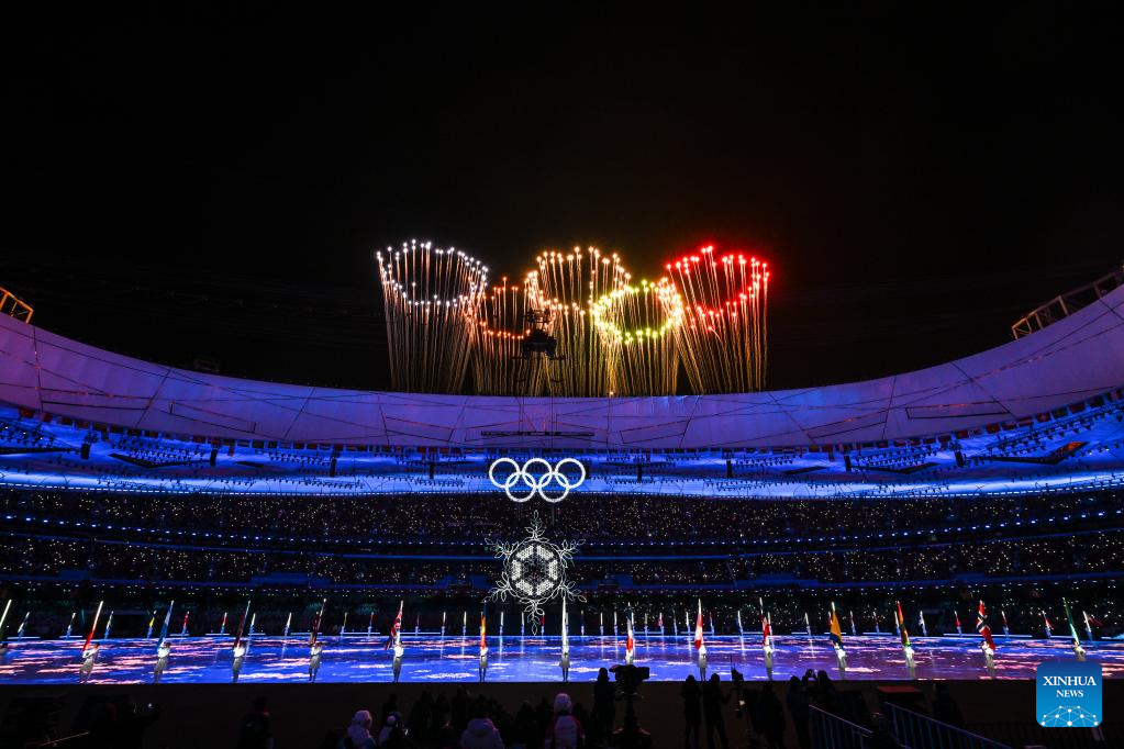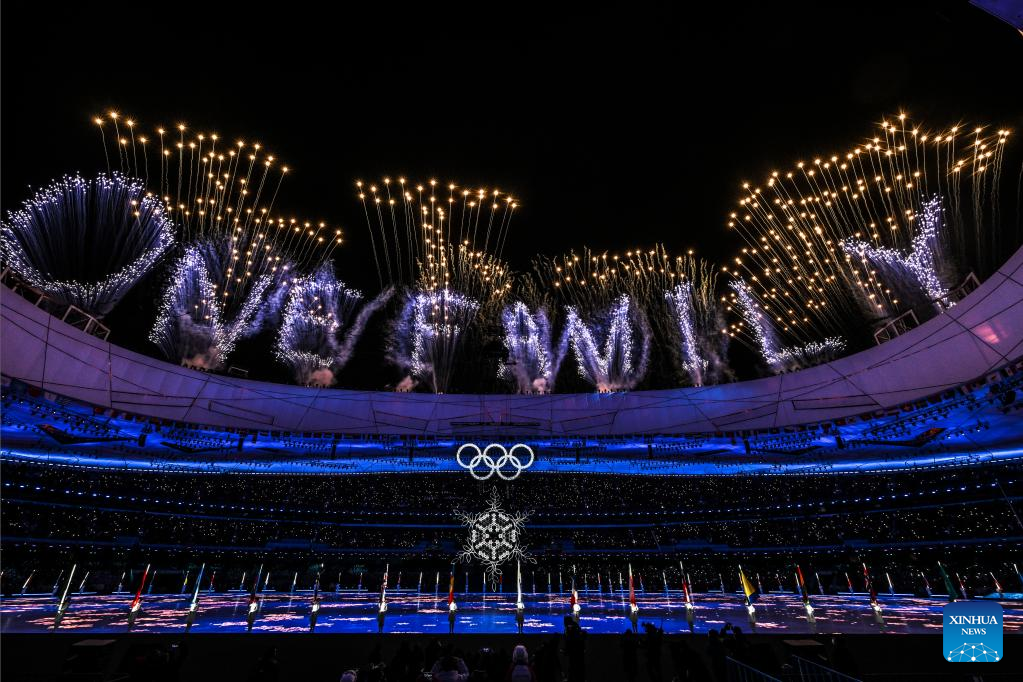 Fireworks illuminate the night sky during the closing ceremony of the Beijing 2022 Olympic Winter Games at the National Stadium in Beijing, capital of China, Feb. 20, 2022. (Xinhua/Xiong Qi)