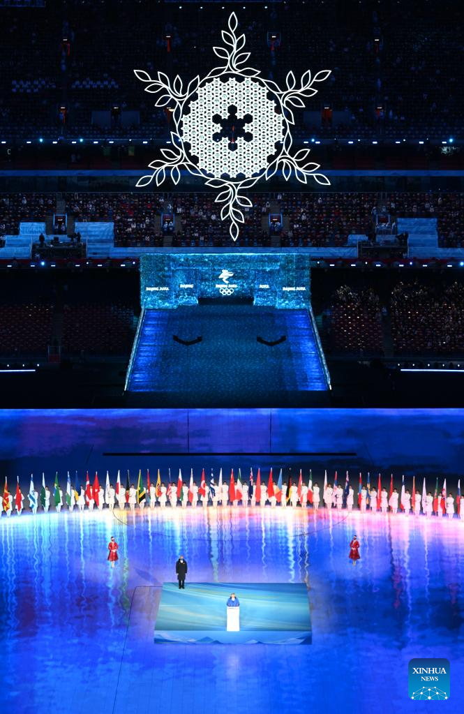 International Olympic Committee President Thomas Bach addresses the closing ceremony of the Beijing 2022 Olympic Winter Games at the National Stadium in Beijing, capital of China, Feb. 20, 2022. (Xinhua/Li He)