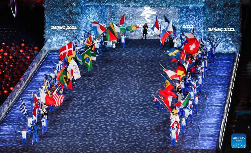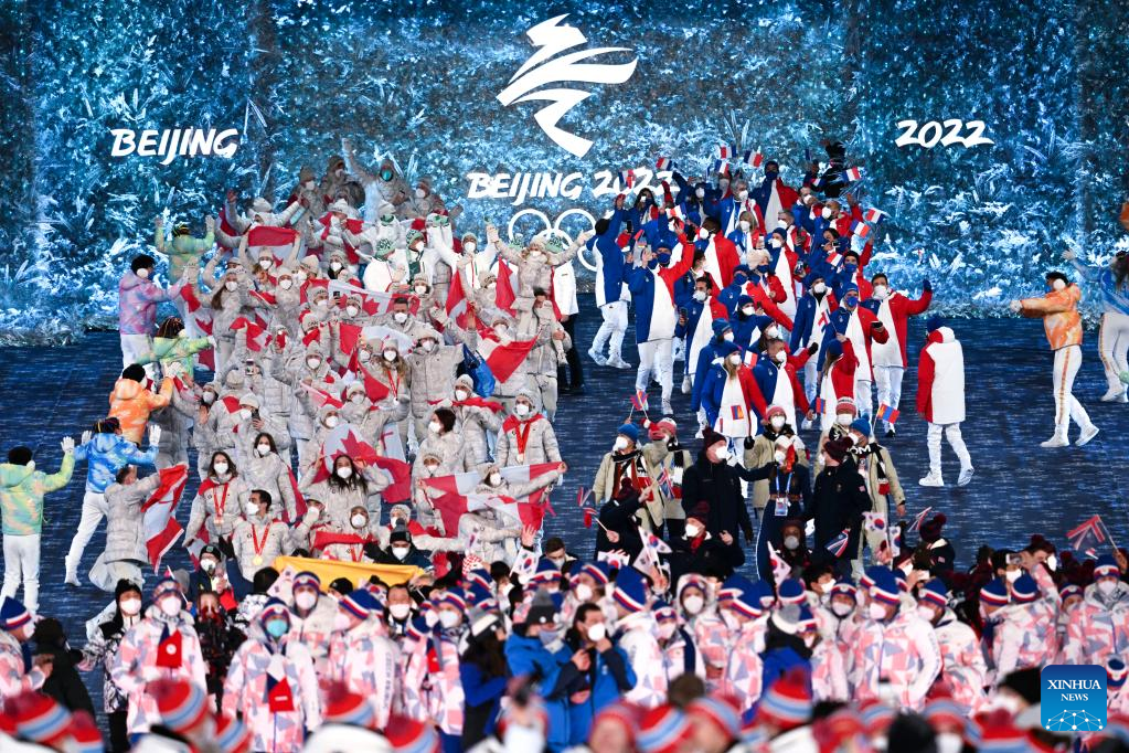 Athletes parade during the closing ceremony of the Beijing 2022 Olympic Winter Games at the National Stadium in Beijing, capital of China, Feb. 20, 2022. (Xinhua/Ding Xu)