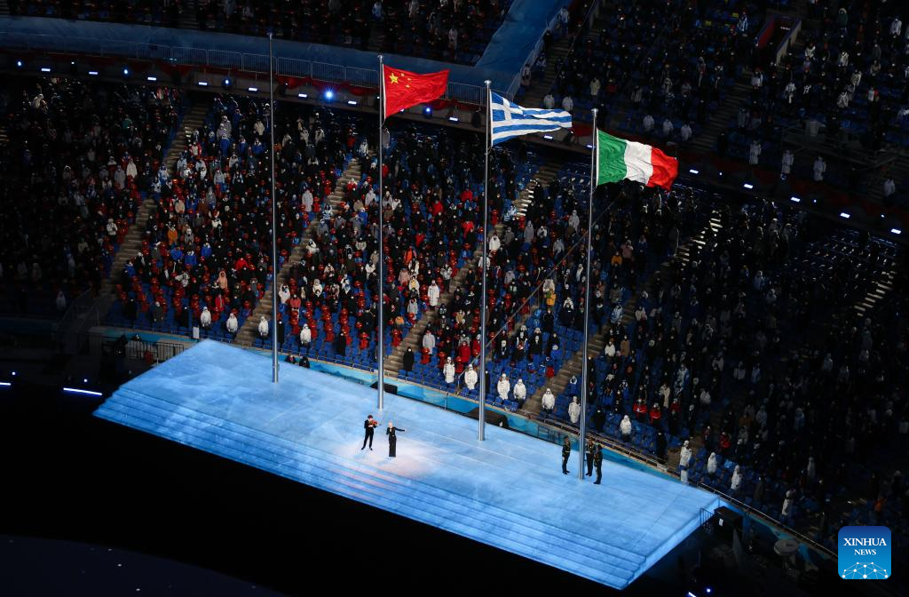 The national flag of Italy is raised during the closing ceremony of the Beijing 2022 Olympic Winter Games at the National Stadium in Beijing, capital of China. (Xinhua/Xu Zijian)