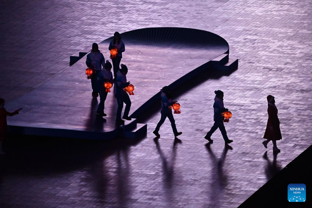 Volunteers leave the stage during the closing ceremony of the Beijing 2022 Olympic Winter Games at the National Stadium in Beijing, capital of China, Feb. 20, 2022. (Xinhua/Huang Xiaobang)