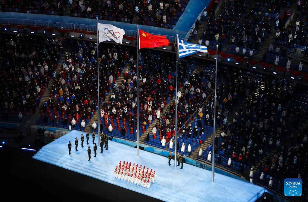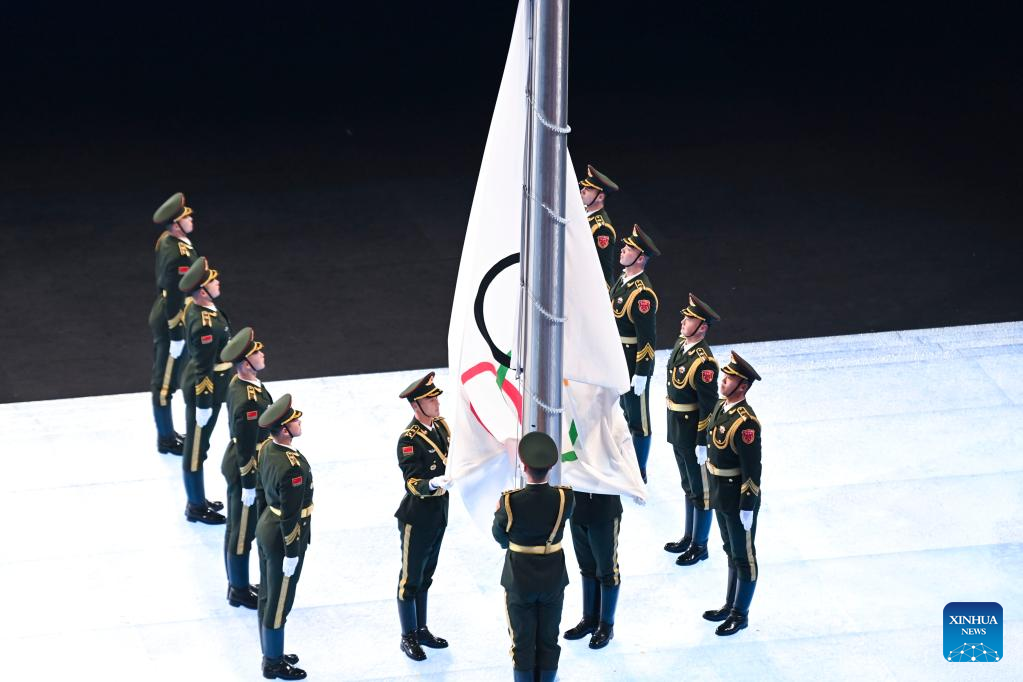The Olympic flag is lowered during the closing ceremony of the Beijing 2022 Olympic Winter Games at the National Stadium in Beijing, capital of China, Feb. 20, 2022. (Xinhua/Huang Zongzhi)