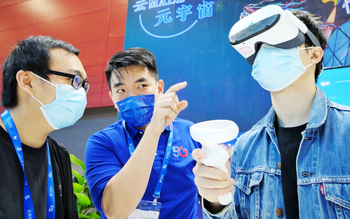 A visitor (right) tries metaverse games at the 2021 International Digital Technology Exhibition and Tianyi Intelligent Ecological Expo in Guangzhou, Guangdong province, on Nov 11. [Photo by Li Zhihao/For China Daily]