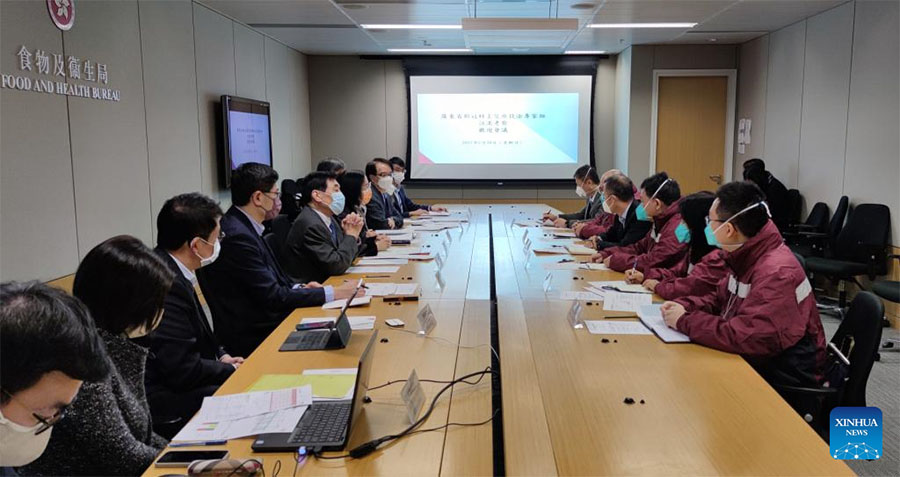 The team of the mainland epidemiological experts exchange views with representatives from the Food and Health Bureau of the Hong Kong Special Administrative Region (HKSAR) government, in south China's Hong Kong, Feb. 20, 2022. Two medical expert delegations from the Chinese mainland continued their inspections of Hong Kong's anti-COVID-19 work and patients treatment on Sunday. (Xinhua/Su Wanming)