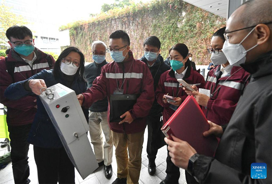 The team of the mainland epidemiological experts, accompanied by representatives from the Department of Health (DH) of the Hong Kong Special Administrative Region (HKSAR) government, visit the Quarantine Center Task Force to learn about the HKSAR government's quarantine and isolation work, in south China's Hong Kong, Feb. 20, 2022. Two medical expert delegations from the Chinese mainland continued their inspections of Hong Kong's anti-COVID-19 work and patients treatment on Sunday. (Xinhua)