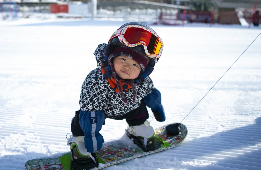 An 11-month-old girl named Wang Yuji practises snowboarding at Thaiwoo Ski Resort in Chongli District of Zhangjiakou City, on Nov. 18, 2021. (Xinhua/Zhang Fan)