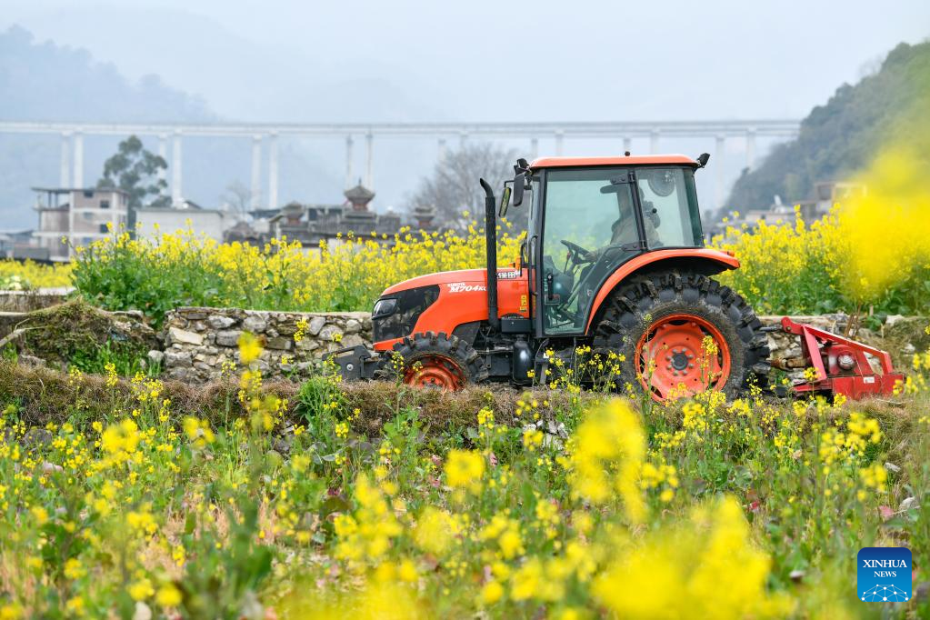 A farmer works in the field in Shangpilin Village of Congjiang County, southwest China's Guizhou Province, Feb. 19, 2022. Saturday marks the day of Yushui, or Rain Water, the second of the solar terms. As Yushui arrives, the temperature will rise and rain will become frequent. Farmers across Guizhou are busy with spring agricultural production. (Xinhua/Yang Wenbin)