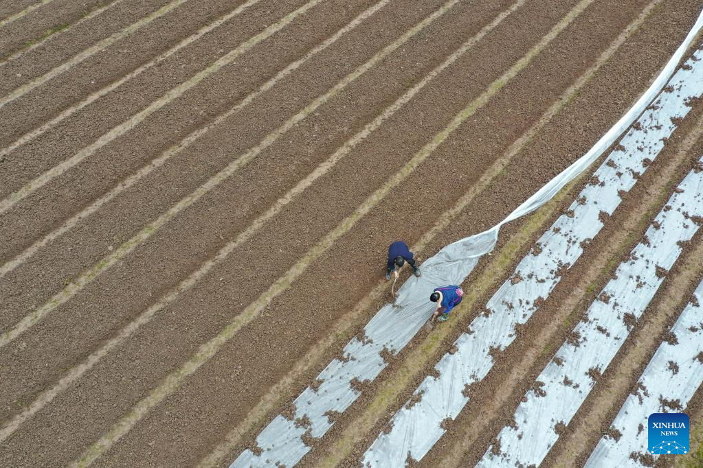 Farmers work in the field in Hexin Village of Qianxi City, southwest China's Guizhou Province, Feb. 19, 2022. Saturday marks the day of Yushui, or Rain Water, the second of the solar terms. As Yushui arrives, the temperature will rise and rain will become frequent. Farmers across Guizhou are busy with spring agricultural production. (Photo by Fan Hui/Xinhua)
