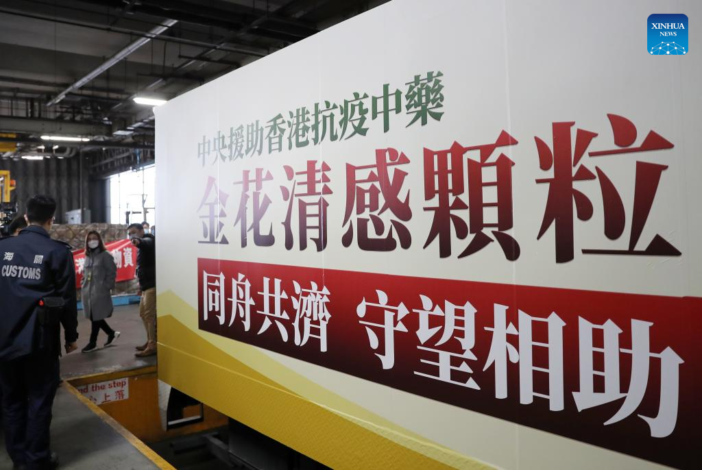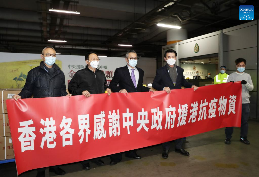 HONG KONG, Feb. 20 (Xinhua) -- The first batch of 150,000 boxes of anti-epidemic traditional Chinese medicines (TCM) donated by the Chinese mainland, as well as some other anti-epidemic supplies ordered previously arrived at Hong Kong on Sunday.