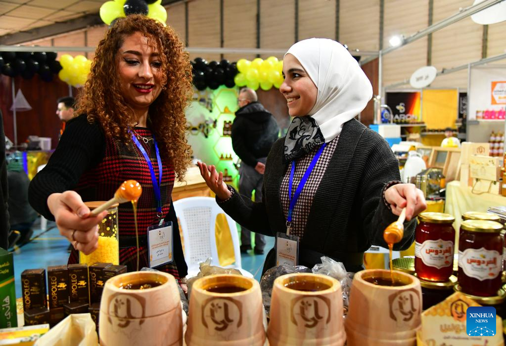 People attend the Honey Festival in Damascus, capital of Syria, Feb. 20, 2022. (Photo by Ammar Safarjalani/Xinhua)