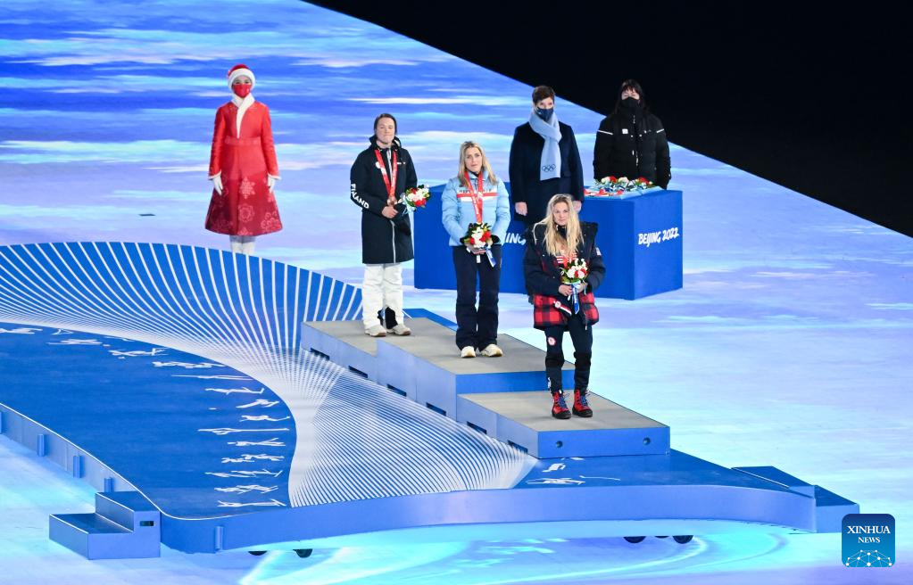 Gold medalist Therese Johaug (front C) of Norway, silver medalist Jessie Diggins (front R) of the United States and bronze medalist Kerttu Niskanen (front L) of Finland attend the awarding ceremony of cross-country skiing women's 30km mass start free during the closing ceremony of the Beijing 2022 Olympic Winter Games at the National Stadium in Beijing, capital of China, Feb. 20, 2022. (Xinhua/Li Yibo)