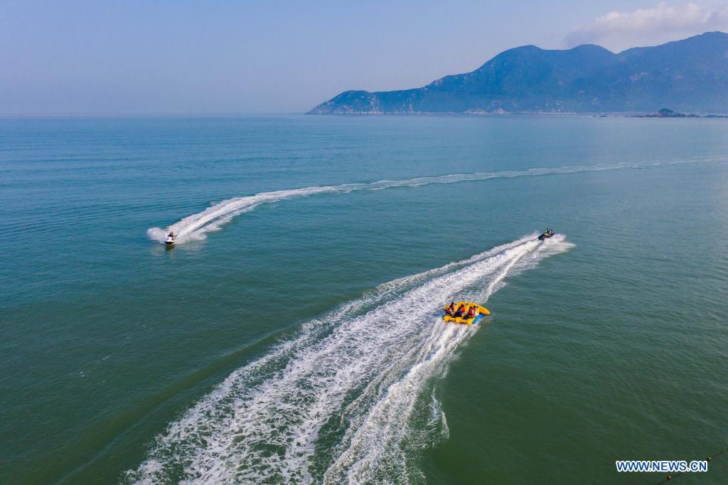Aerial photo taken on June 24, 2021, shows tourists riding a speedboat in Zhoushan, East China's Zhejiang province. [Photo/Xinhua]