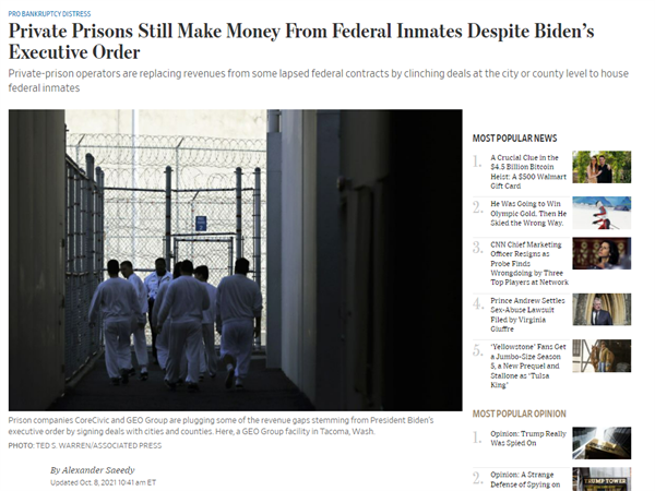 An article published on the website of The Wall Street Journal points out that the Biden administration’s executive order directing the Justice Department not to renew any expiring contracts with privately-operated detention facilities hasn’t in fact prevented private prisons from continuing to profit from their provision of inmate services, October 2021. (Screenshot of the website of The Wall Street Journal)