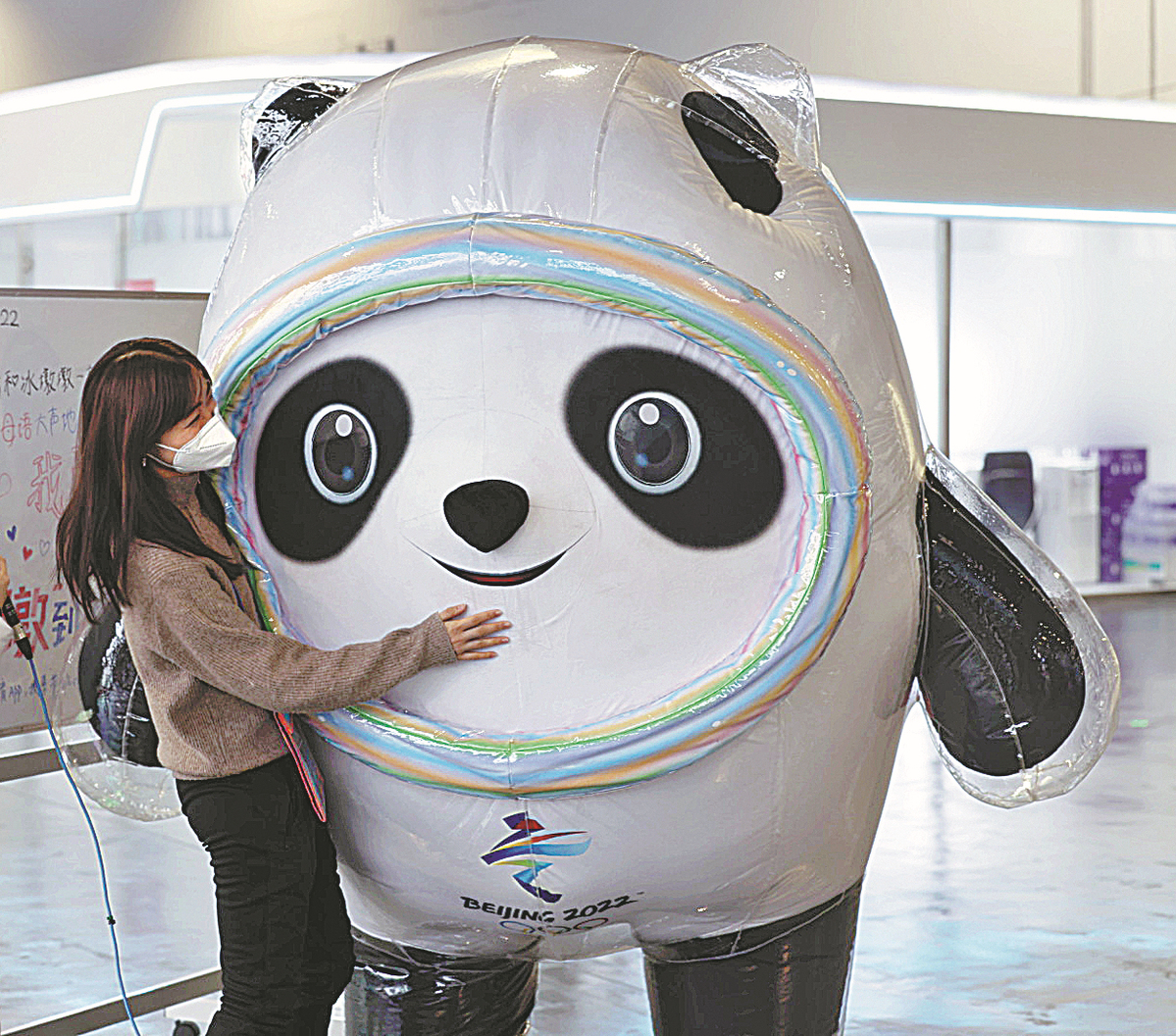 A journalist poses with the 2022 Winter Olympic mascot Bing Dwen Dwen at the Beijing Media Center on Feb 13. FENG YONGBIN/CHINA DAILY