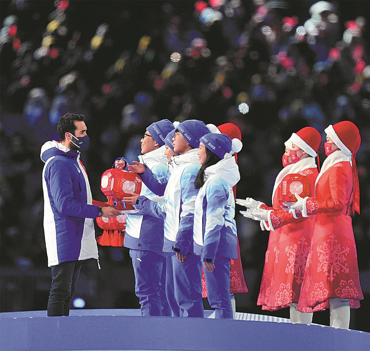 Representatives of volunteers for the Beijing 2022 Winter Olympics are given souvenirs on Sunday in thanks for their service during the Games' closing ceremony at the National Stadium in Beijing. JU HUANZONG/XINHUA