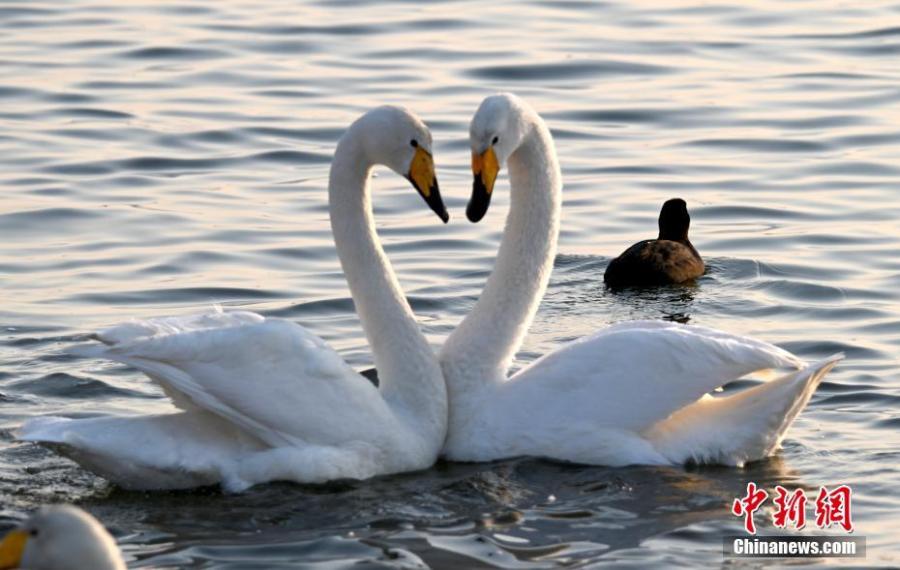 A pair of whooper swans share an intimate moment at Yinghua Lake, Rongcheng city in east China's Shandong Province, Feb. 21, 2022. (Photo: China News Service/Yang Zhili)