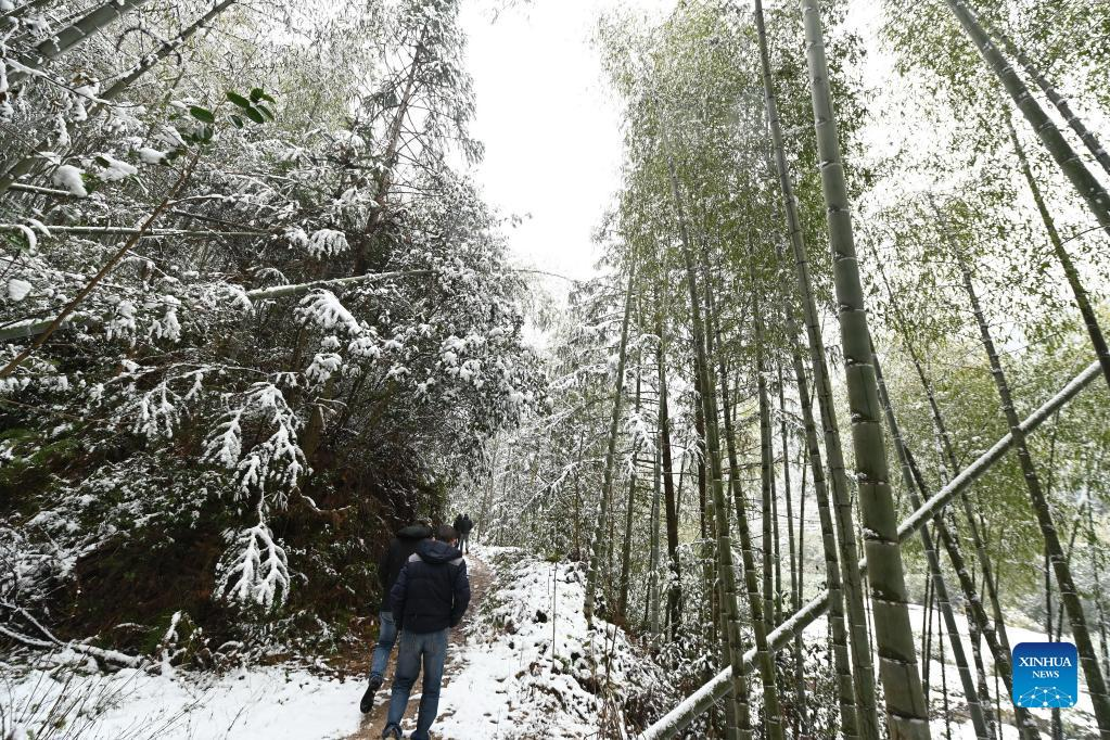 Photo taken on Feb. 21, 2022 shows the snow view of a bamboo forest in Da'an Village of Yangzhuang Township of Wuyishan, Nanping, southeast China's Fujian Province. (Xinhua/Lin Shanchuan)