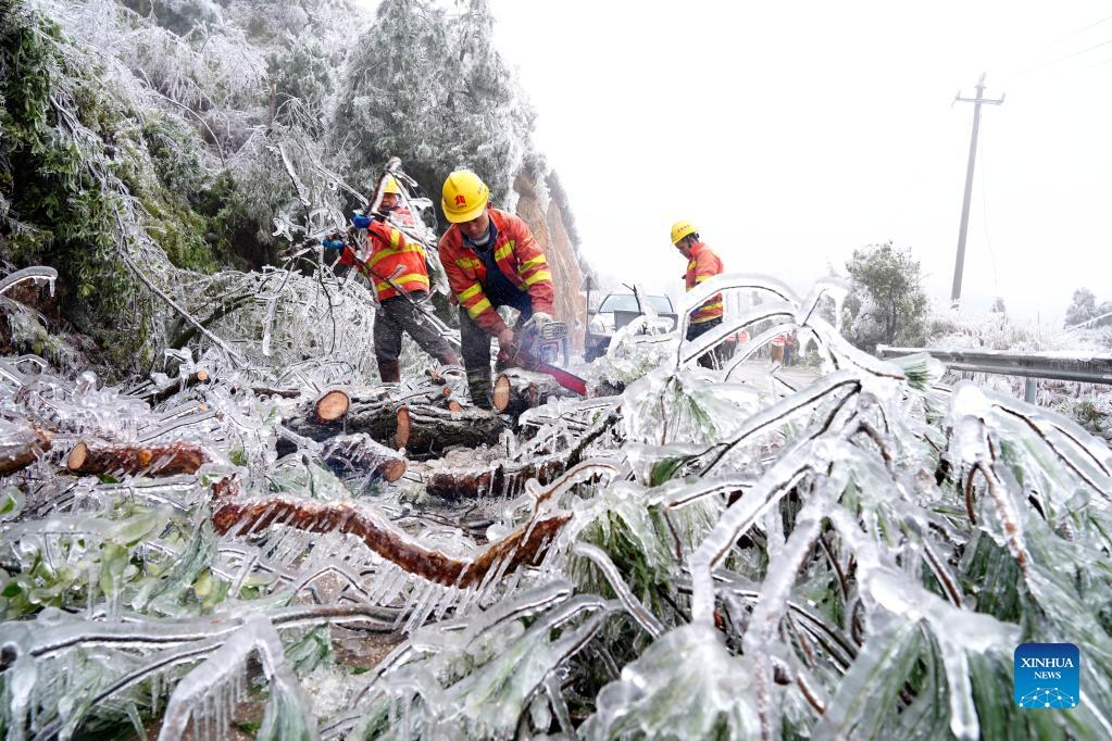 Staff members remove the branches crushed by snow and ice in Jinxiu Town of Jinxiu Yao Autonomous County, south China's Guangxi Zhuang Autonomous Region, Feb. 21, 2022. (Photo by Gao Rujin/Xinhua)