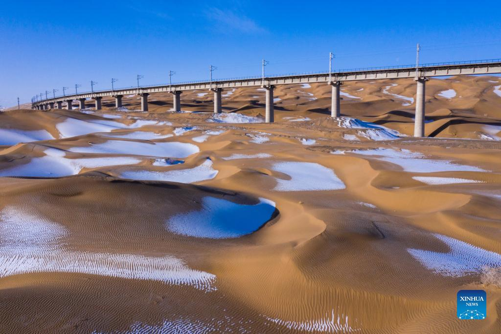 Photo taken on Feb, 21, 2022 shows the snow view in the desert of Aksay Kazakh Autonomous County, Jiuquan, northwest China's Gansu Province. (Photo by Gao Hongshan/Xinhua)