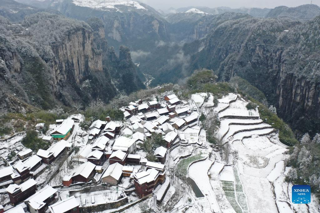 Photo taken on Feb. 21, 2022 shows the snow view of Aizhai Town in Jishou City of Xiangxi Tujia and Miao Autonomous Prefecture, central China's Hunan Province. (Photo by Liu Zhenjun/Xinhua)