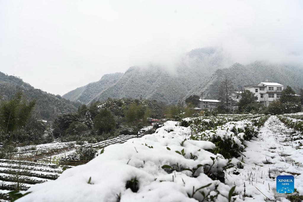 Photo taken on Feb. 21, 2022 shows the snow view of a tea garden in Da'an Village of Yangzhuang Township of Wuyishan, Nanping, southeast China's Fujian Province. (Xinhua/Lin Shanchuan)