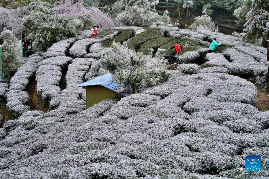 Villagers clean the ice and snow at a tea garden in Jinxiu Town of Jinxiu Yao Autonomous County, south China's Guangxi Zhuang Autonomous Region, Feb. 21, 2022. (Photo by Gao Rujin/Xinhua)