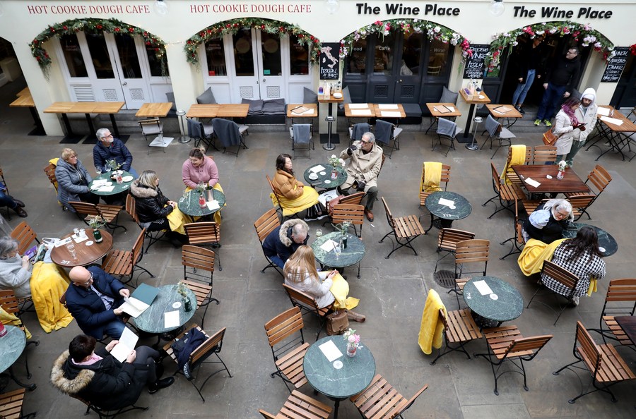 People dine outside Covent Garden in London, Britain, Feb. 10, 2022. (Xinhua/Li Ying)