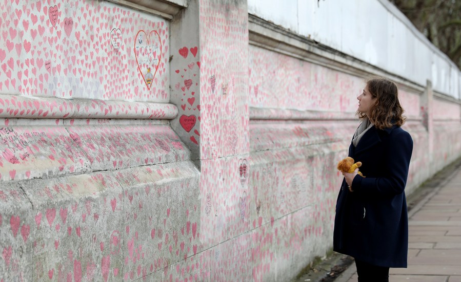 A woman watches the National COVID Memorial Wall on the south bank of the Thames River in London, Britain, Feb. 10, 2022. (Xinhua/Li Ying)