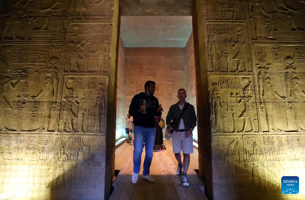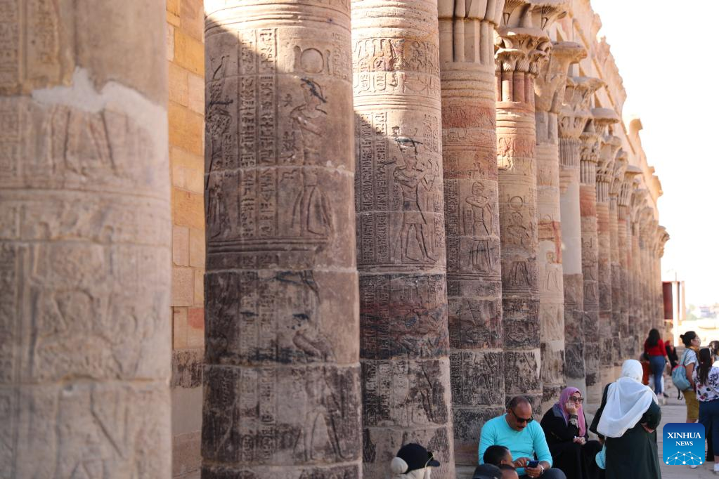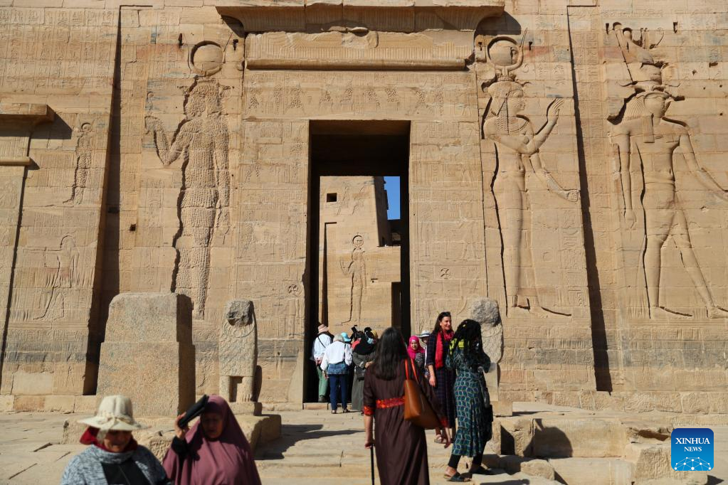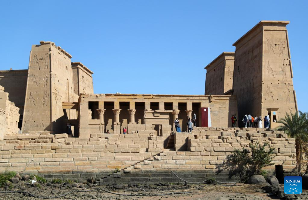 Tourists visit the Philae temple complex in Aswan, Egypt, on Feb. 21, 2022. The Philae temple complex, one of the most popular tourist destinations in Aswan, is entering tourist season. (Xinhua/Sui Xiankai)