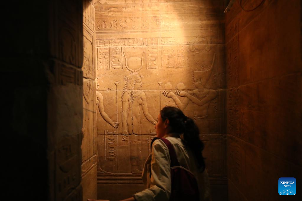 A tourist visits the Philae temple complex in Aswan, Egypt, on Feb. 21, 2022. The Philae temple complex, one of the most popular tourist destinations in Aswan, is entering tourist season. (Xinhua/Sui Xiankai)