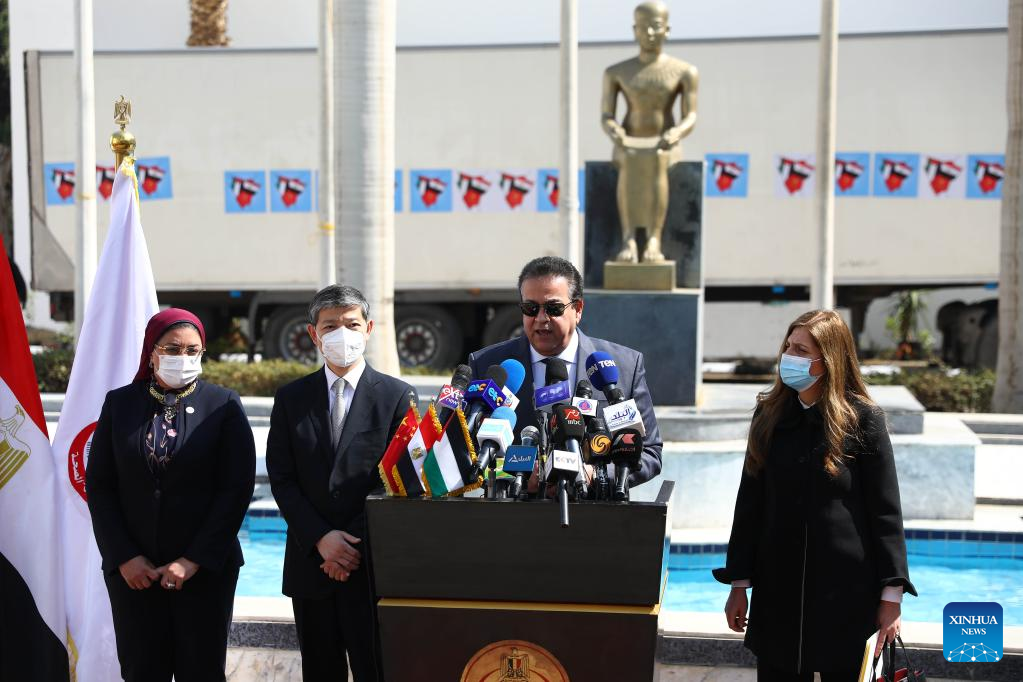 Khaled Abdel-Ghaffar (2nd R), Egypt's acting health minister and higher education minister, speaks during a ceremony to donate COVID-19 vaccines jointly produced by China and Egypt to Palestine at the headquarters of VACSERA in Giza, Egypt, on Feb. 20, 2022. (Xinhua/Ahmed Gomaa)