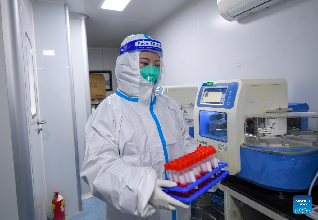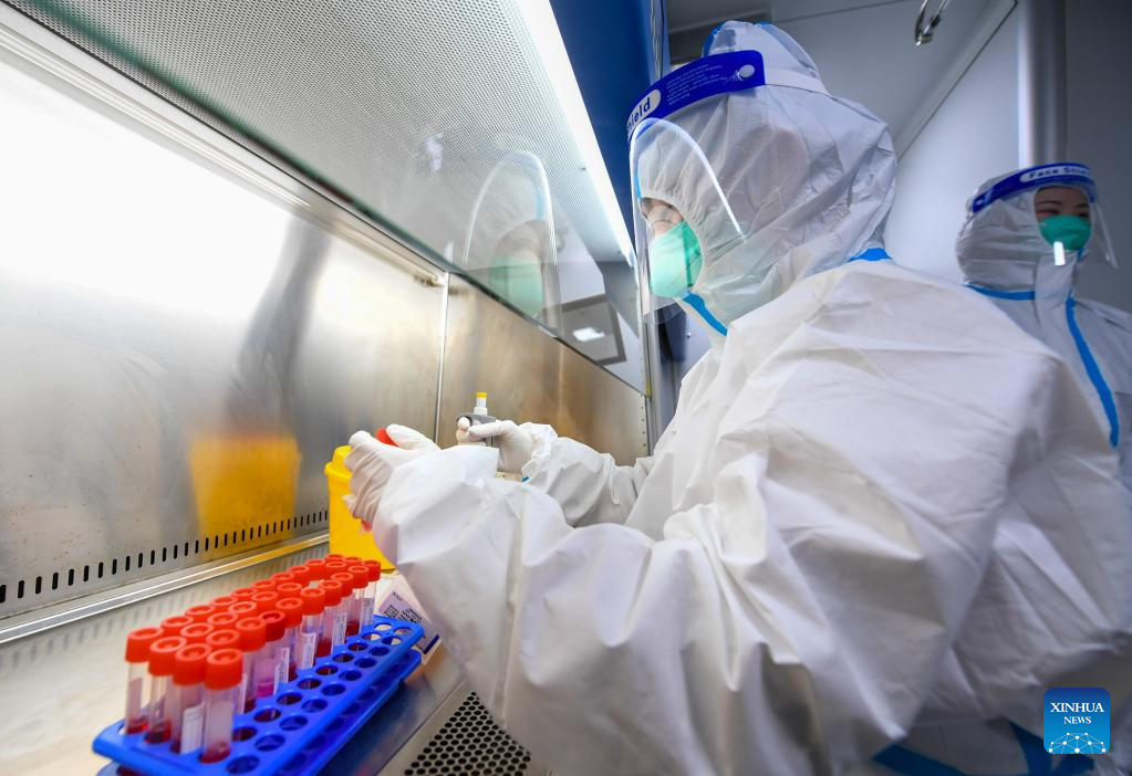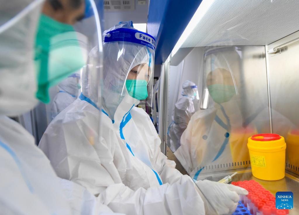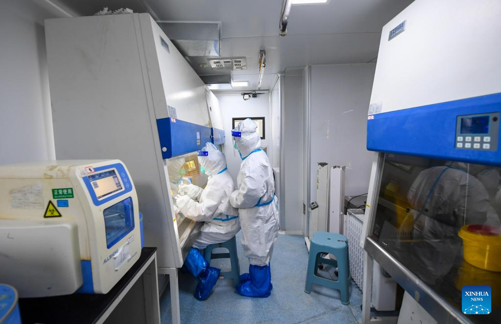 Medical staff members work inside a COVID-19 testing laboratory in Hohhot, north China's Inner Mongolia Autonomous Region, Feb. 20, 2022. Hohhot launched its third round of COVID-19 nucleic acid testing on Monday. Mobile PCR laboratories and air-inflated laboratories have been put into use to improve testing efficiency.