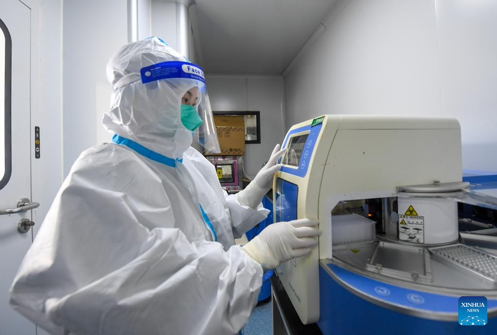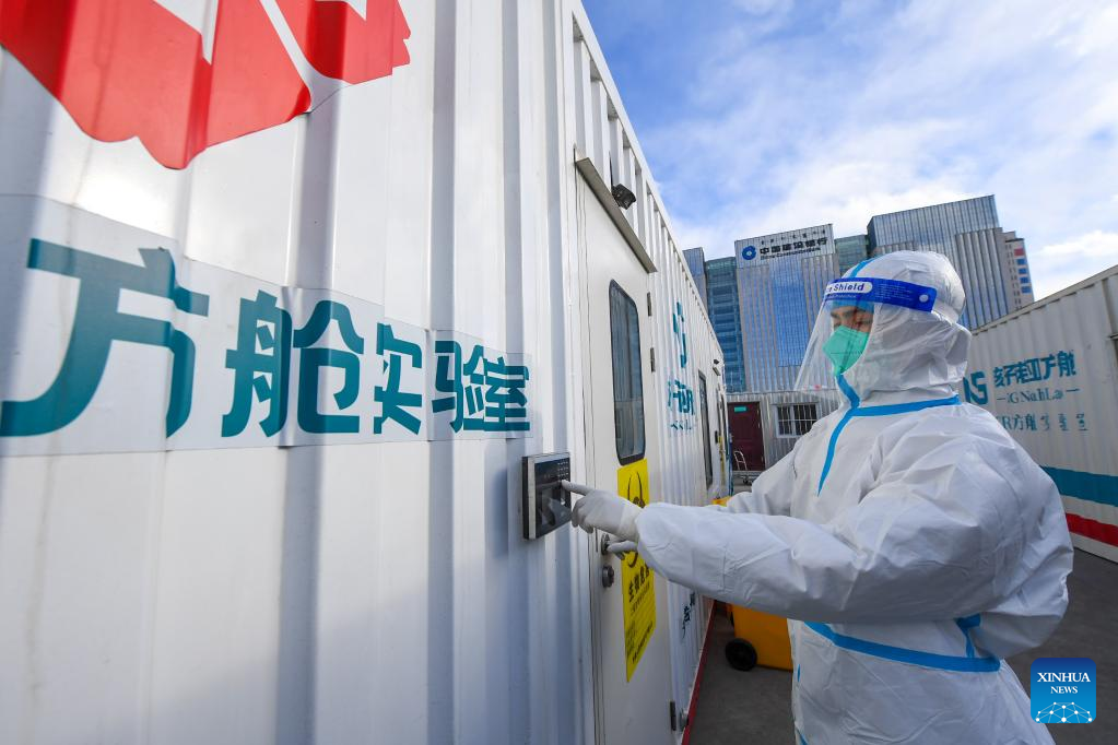 A medical staff member works inside a COVID-19 testing laboratory in Hohhot, north China's Inner Mongolia Autonomous Region, Feb. 20, 2022. Hohhot launched its third round of COVID-19 nucleic acid testing on Monday. Mobile PCR laboratories and air-inflated laboratories have been put into use to improve testing efficiency.