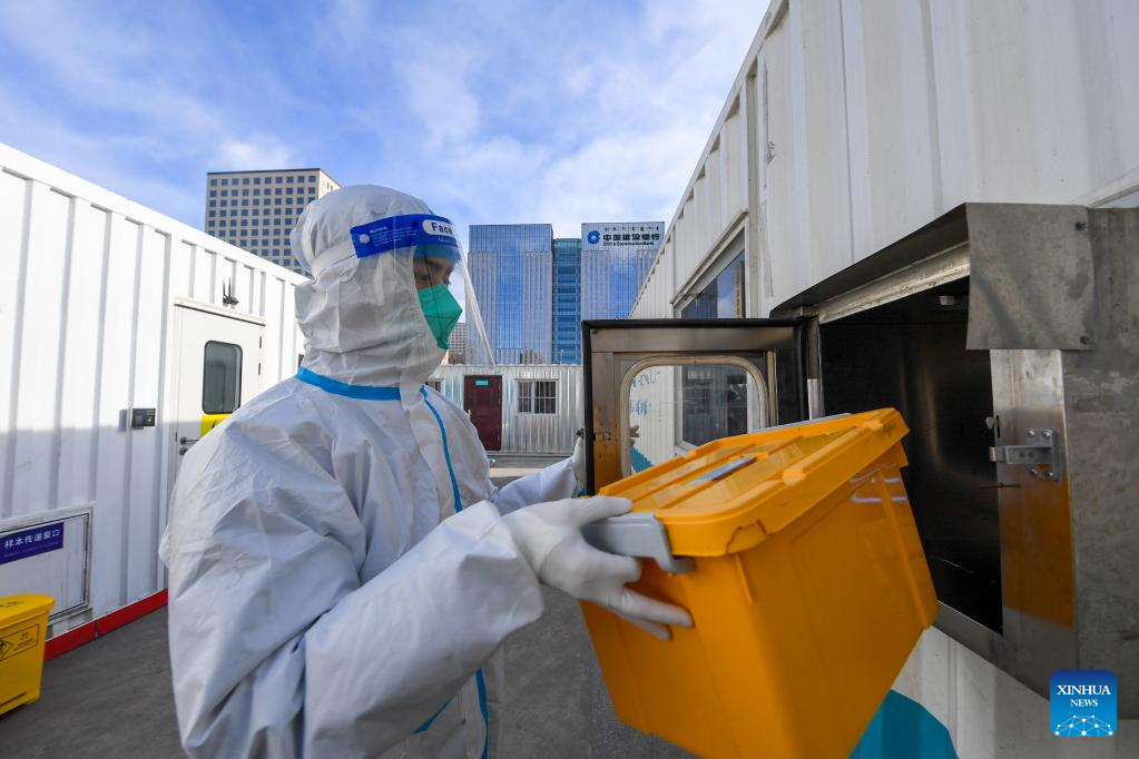 A medical worker delivers COVID-19 test samples through the window of a testing laboratory in Hohhot, north China's Inner Mongolia Autonomous Region, Feb. 20, 2022. Hohhot launched its third round of COVID-19 nucleic acid testing on Monday. Mobile PCR laboratories and air-inflated laboratories have been put into use to improve testing efficiency.