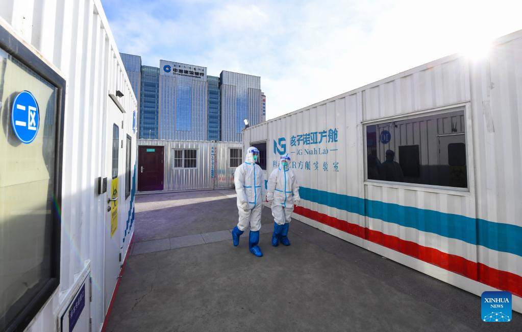 Medical workers walk outside a COVID-19 testing laboratory in Hohhot, north China's Inner Mongolia Autonomous Region, Feb. 20, 2022. Hohhot launched its third round of COVID-19 nucleic acid testing on Monday. Mobile PCR laboratories and air-inflated laboratories have been put into use to improve testing efficiency.