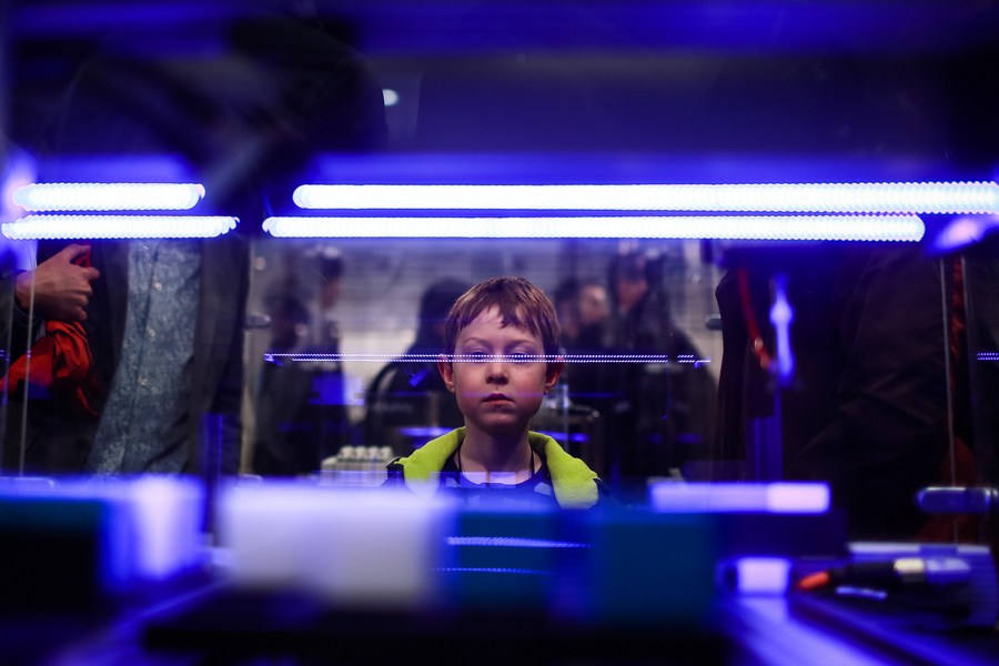 A boy views a digital factory model at Festo's stand at the 2016 Hanover Industrial Trade Fair in Hanover, Germany, on April 27, 2016. (Xinhua/Zhang Fan)