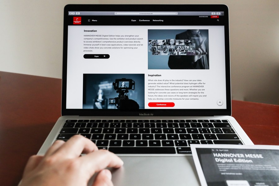 Photo taken on April 12, 2021 shows a screen displaying a website page of Hanover Messe 2021 Digital Edition in Berlin, capital of Germany. (Xinhua/Shan Yuqi)