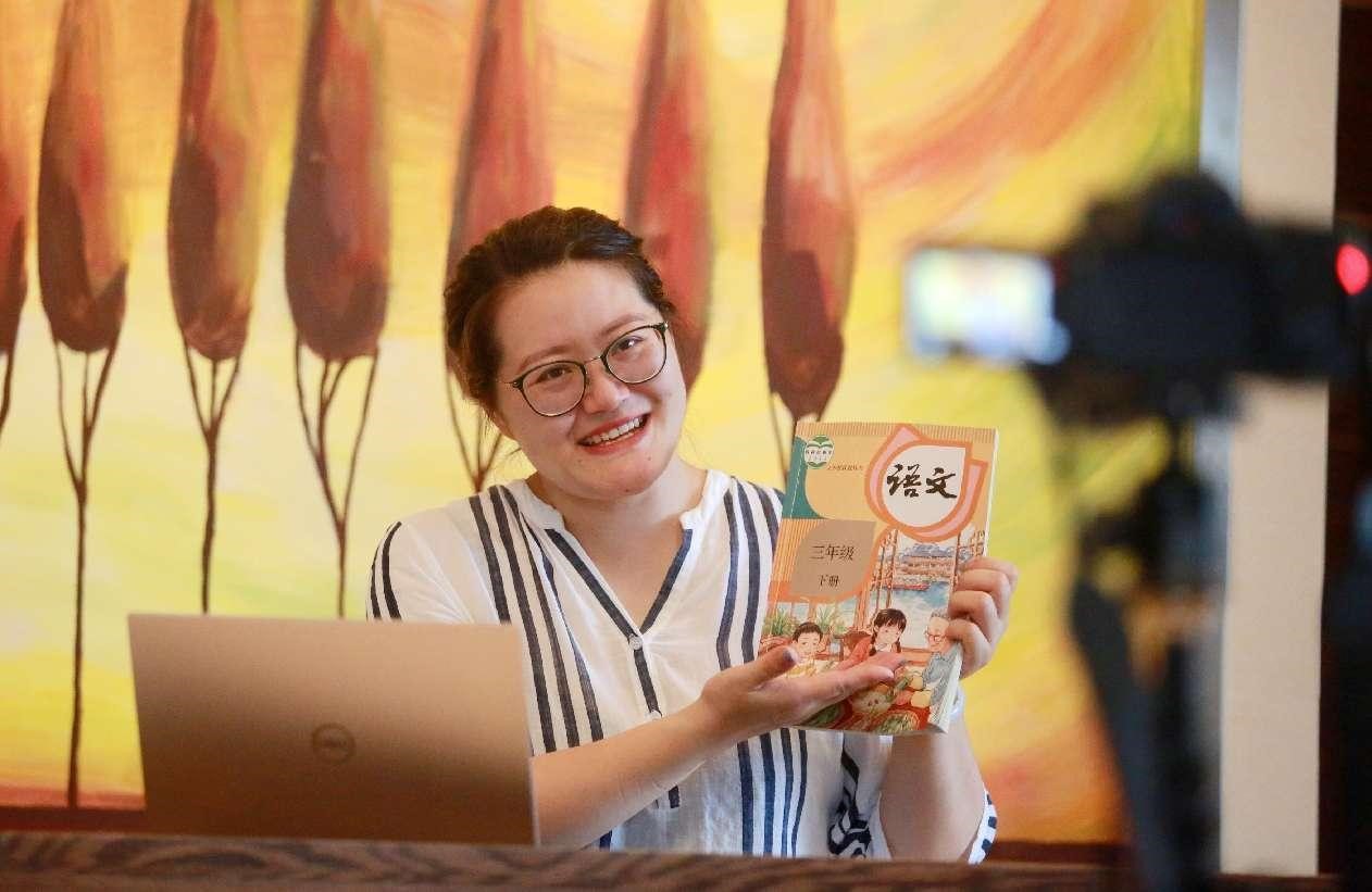 A Chinese teacher at a school in Yangzhou city, east China’s Jiangsu province, gives an online class from her home, Sept. 2, 2021. (People’s Daily Online/Meng Delong)