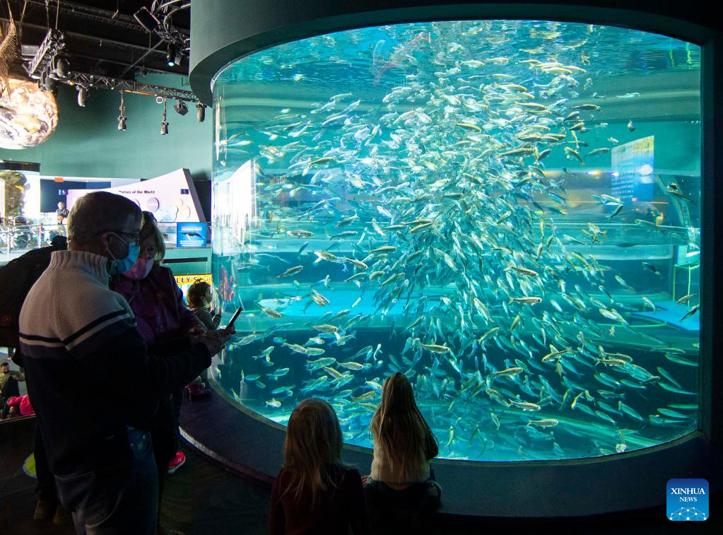 Visitors look at alewives in a water tank at Ripley's Aquarium of Canada in Toronto, Canada, on Feb. 21, 2022. The Ripley's Aquarium of Canada drew many families to celebrate Family Day on Monday. (Photo by Zou Zheng/Xinhua)