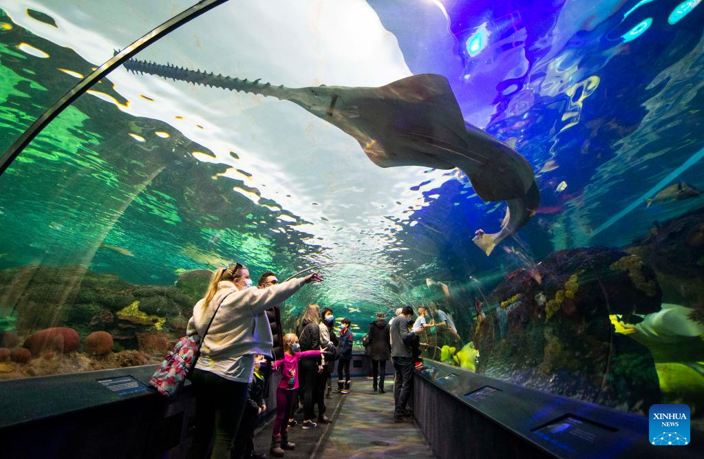 Visitors look at fishes in a water tank at Ripley's Aquarium of Canada in Toronto, Canada, on Feb. 21, 2022. The Ripley's Aquarium of Canada drew many families to celebrate Family Day on Monday. (Photo by Zou Zheng/Xinhua)