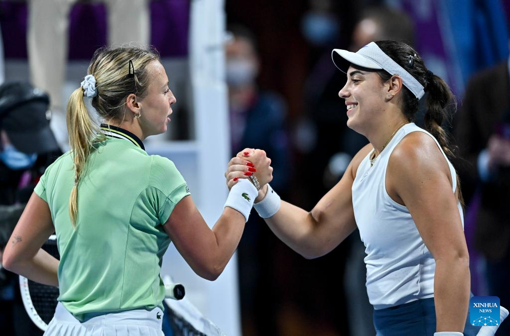 Anett Kontaveit (L) of Estonia shakes hands with Ana Konjuh of Croatia after during the round of 32 of WTA Qatar Open tennis tournament match at the Khalifa International Tennis Complex in Doha, capital of Qatar, on Feb. 21, 2022. (Photo by Nikku/Xinhua)