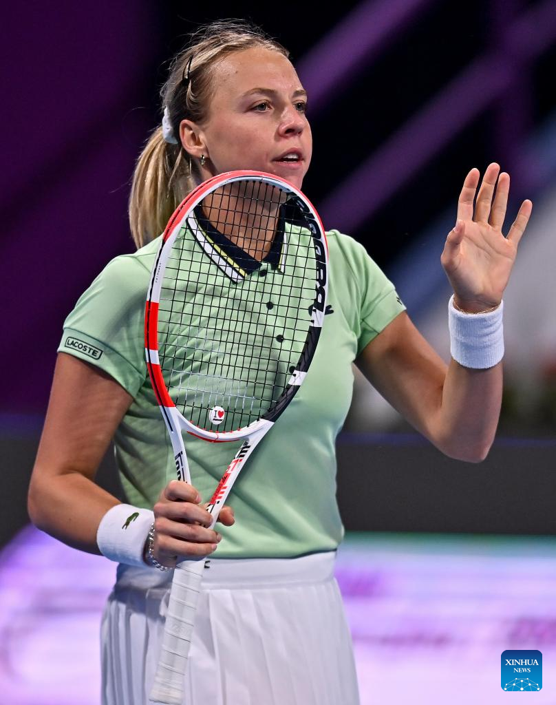 Anett Kontaveit of Estonia reacts during the round of 32 of WTA Qatar Open tennis tournament match against Ana Konjuh of Croatia at the Khalifa International Tennis Complex in Doha, capital of Qatar, on Feb. 21, 2022. (Photo by Nikku/Xinhua)