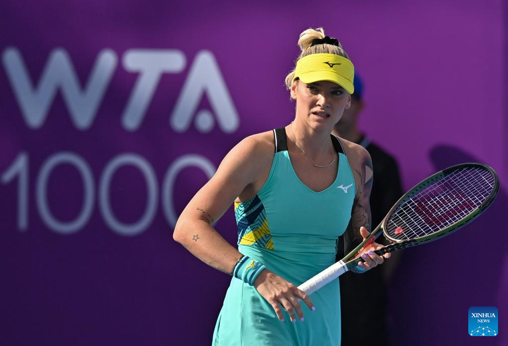 Tereza Martincova of Czech Republic reacts during the first round of WTA Qatar Open tennis tournament match against Elina Svitolina of Ukraine at the Khalifa International Tennis Complex in Doha, capital of Qatar, on Feb. 21, 2022. (Photo by Nikku/Xinhua)