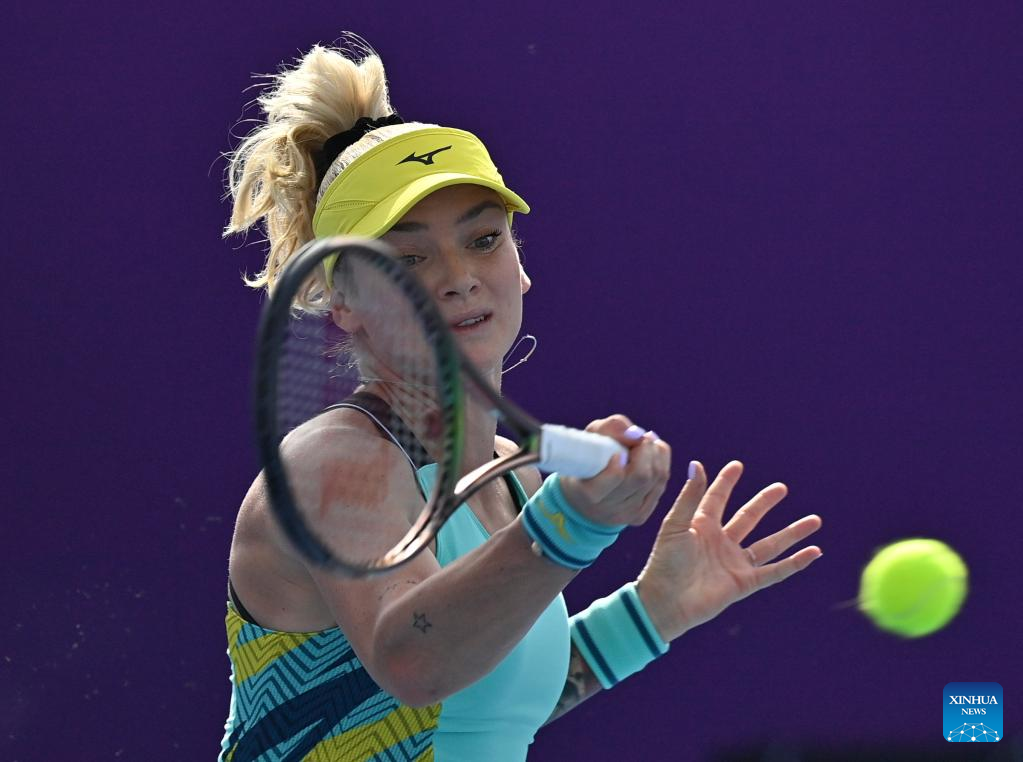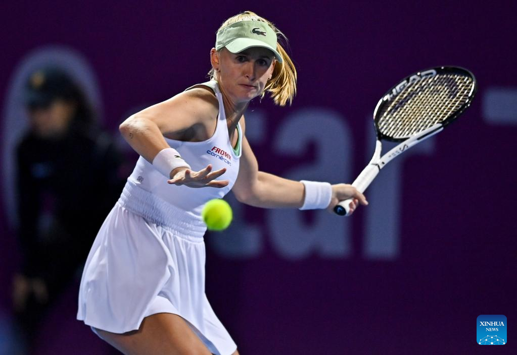 Tereza Martincova of Czech Republic hits a return during the first round of WTA Qatar Open tennis tournament match against Elina Svitolina of Ukraine at the Khalifa International Tennis Complex in Doha, capital of Qatar, on Feb. 21, 2022. (Photo by Nikku/Xinhua)