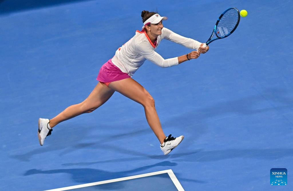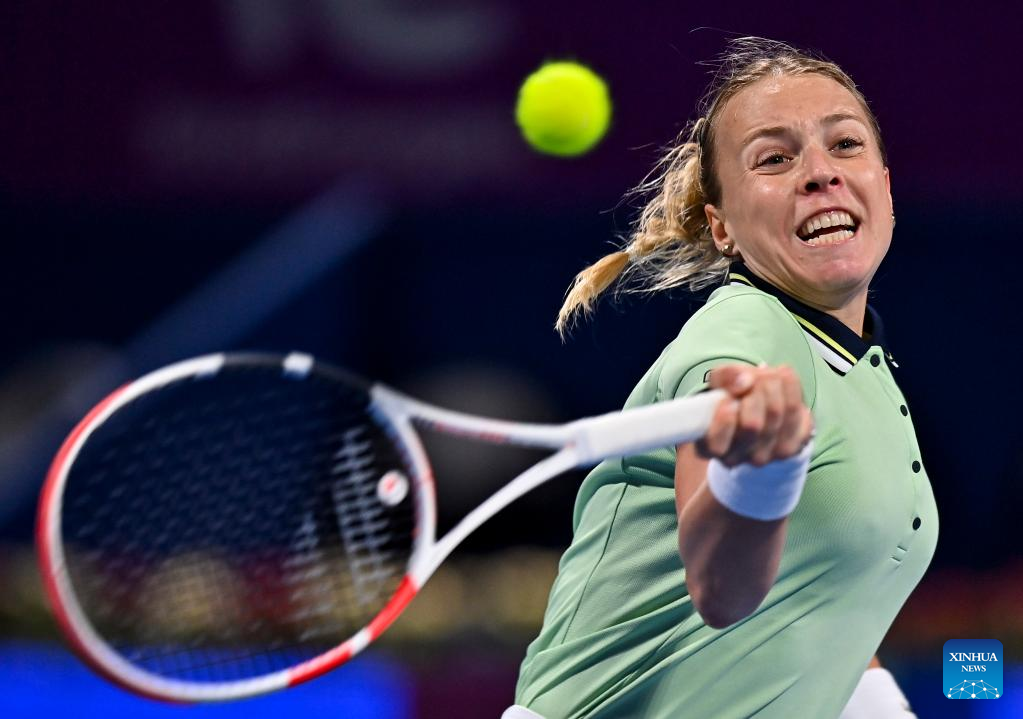 Anett Kontaveit of Estonia hits a return during the round of 32 of WTA Qatar Open tennis tournament match against Ana Konjuh of Croatia at the Khalifa International Tennis Complex in Doha, capital of Qatar, on Feb. 21, 2022. (Photo by Nikku/Xinhua)
