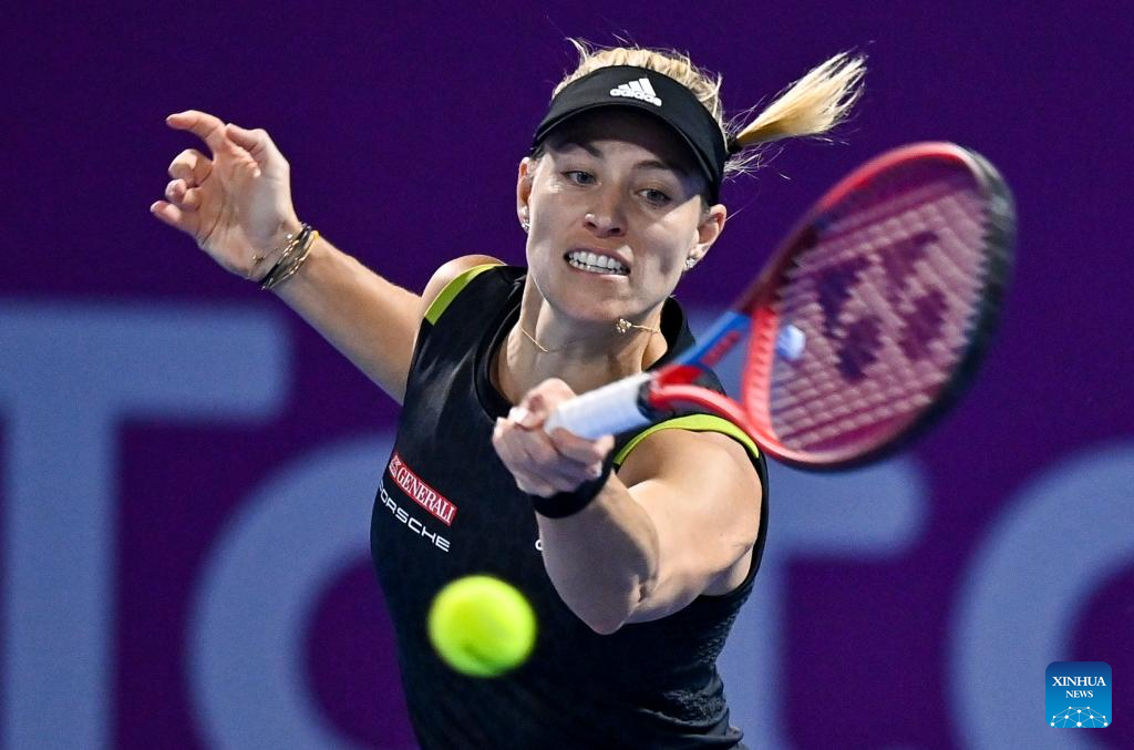 Angelique Kerber of Germany hits a return during the first round of WTA Qatar Open tennis tournament match against Jil Teichmann of Switzerland at the Khalifa International Tennis Complex in Doha, capital of Qatar, on Feb. 21, 2022. (Photo by Nikku/Xinhua)