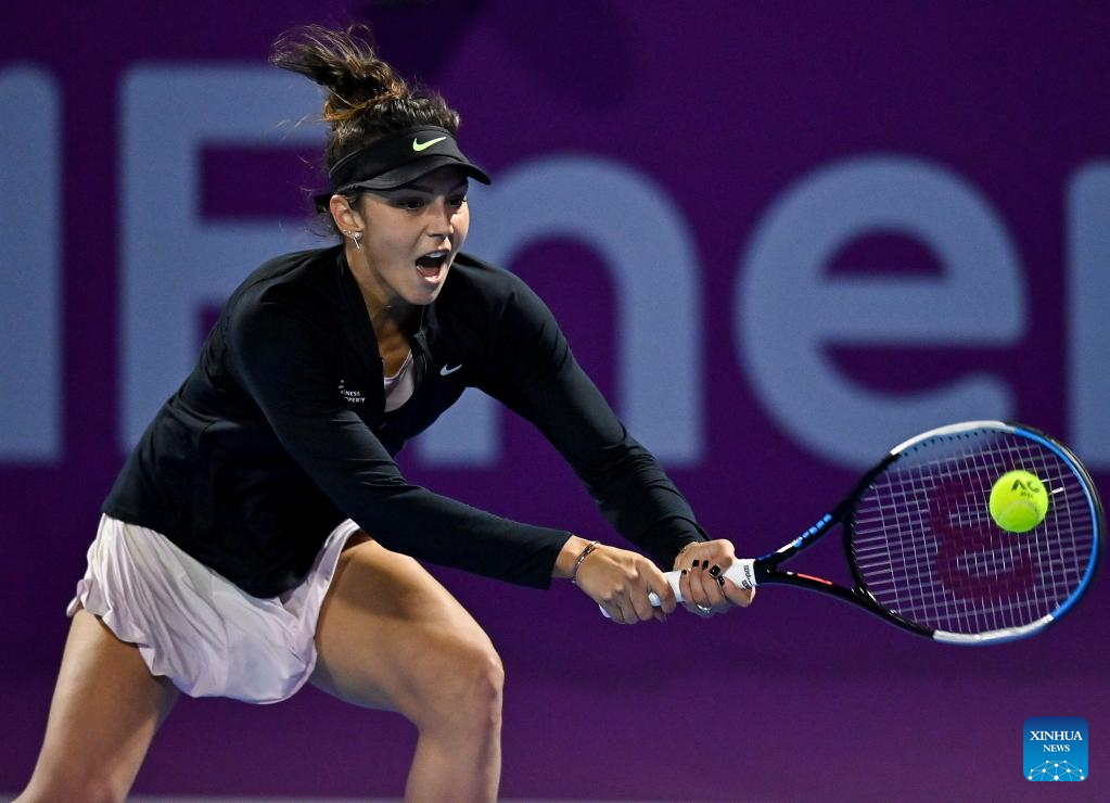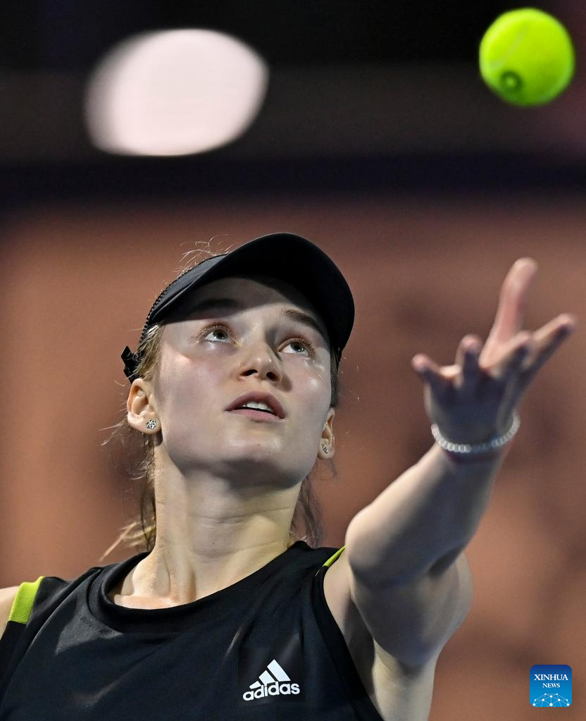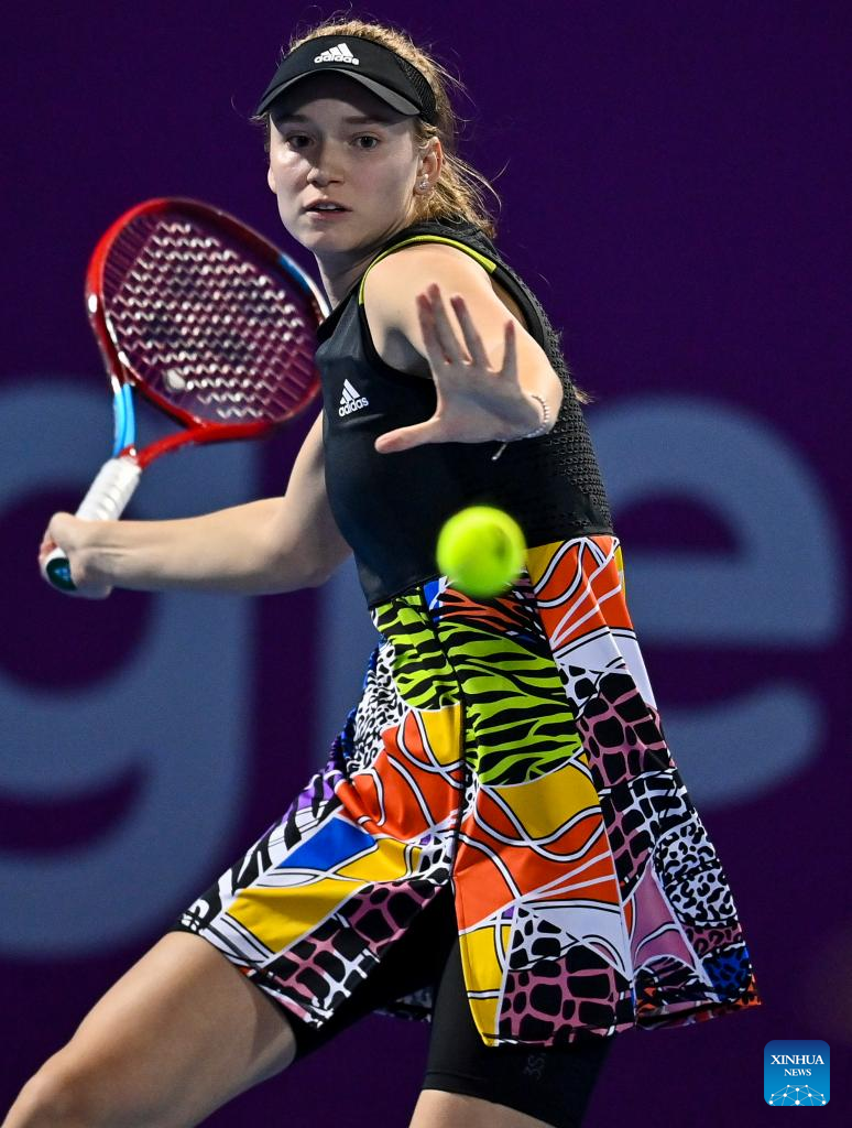 Elena Rybakina of Kazakistan hits a return during the first round of WTA Qatar Open tennis tournament match against Jaqueline Cristian of Romania at the Khalifa International Tennis Complex in Doha, capital of Qatar, on Feb. 21, 2022. (Photo by Nikku/Xinhua)