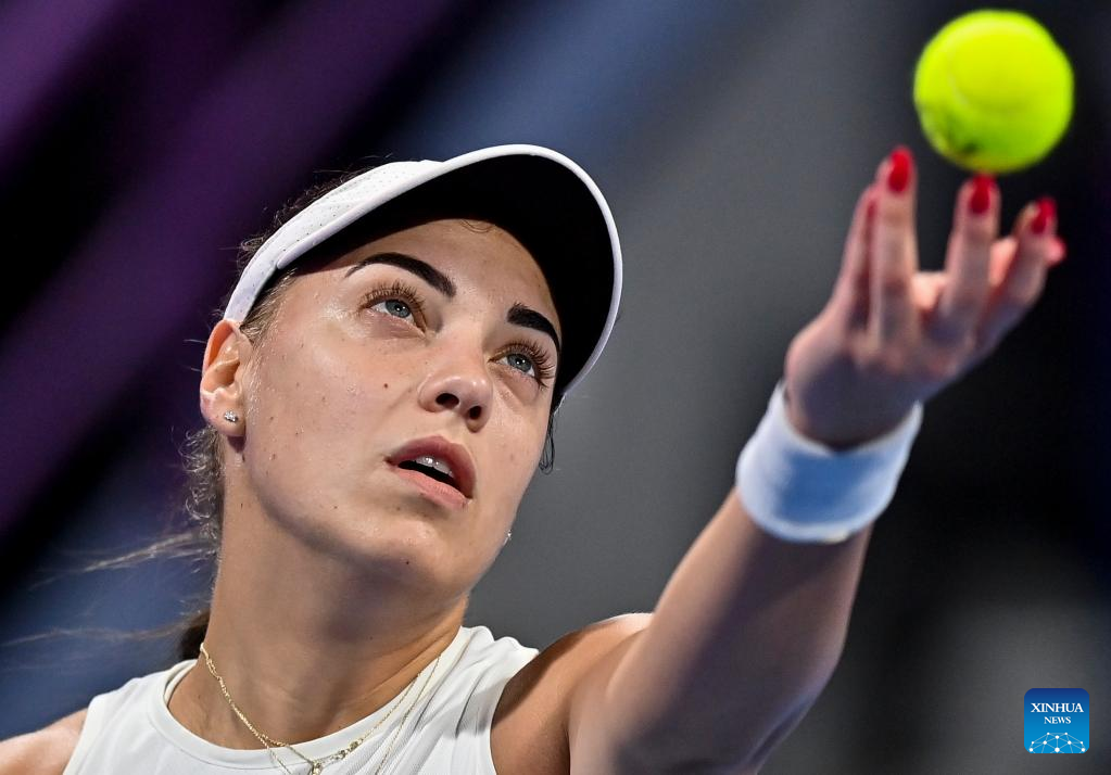 Ana Konjuh of Croatia serves during the round of 32 of WTA Qatar Open tennis tournament match against Anett Kontaveit of Estonia at the Khalifa International Tennis Complex in Doha, capital of Qatar, on Feb. 21, 2022. (Photo by Nikku/Xinhua)