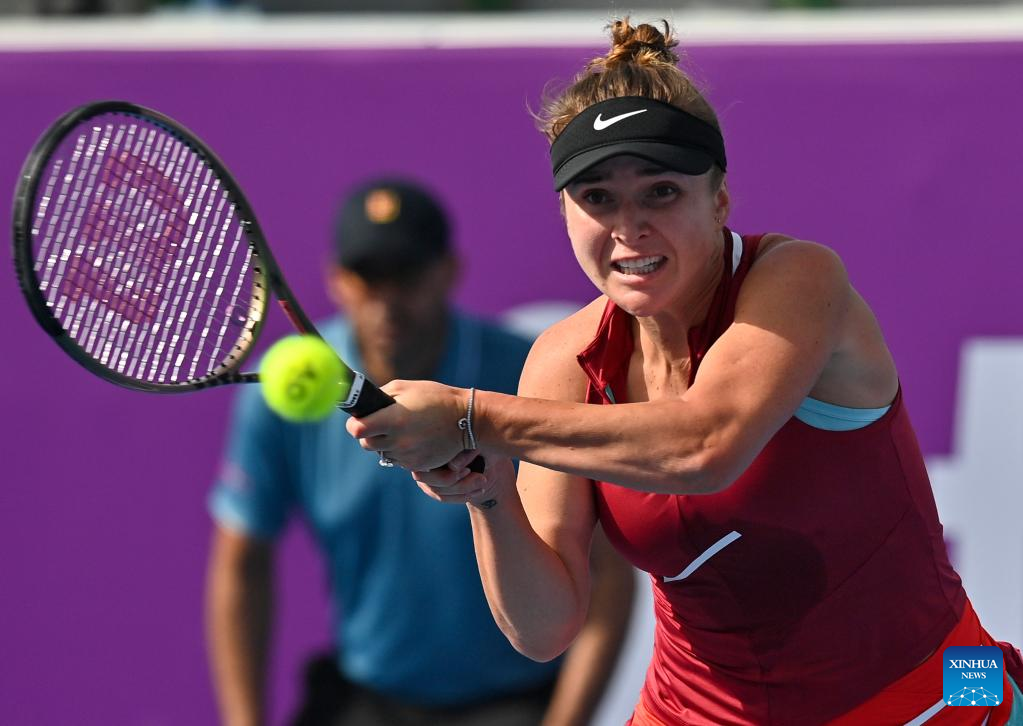 Elina Svitolina of Ukraine hits a return during the first round of WTA Qatar Open tennis tournament match against Tereza Martincova of Czech Republic at the Khalifa International Tennis Complex in Doha, capital of Qatar, on Feb. 21, 2022. (Photo by Nikku/Xinhua)
