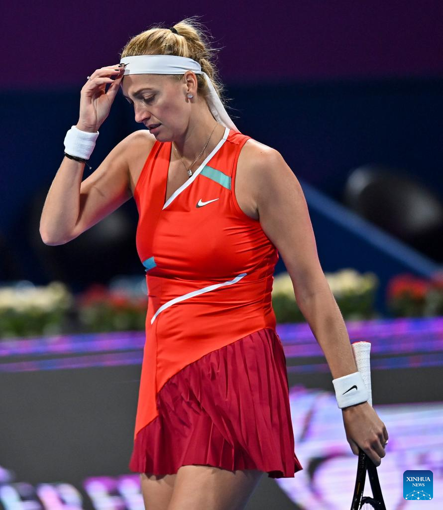 Petra Kvitova of the Czech Republic reacts during the first round of WTA Qatar Open tennis tournament match against Irina-Camelia Begu of Romania at the Khalifa International Tennis Complex in Doha, capital of Qatar, on Feb. 21, 2022. (Photo by Nikku/Xinhua)